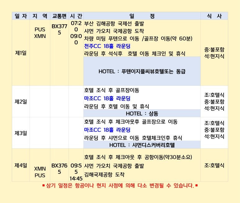 - 1일차: 부산 07:20 출발 → 샤먼 09:00 도착 → 천주CC 18홀 라운딩 → 호텔(푸텐 이지플러스)