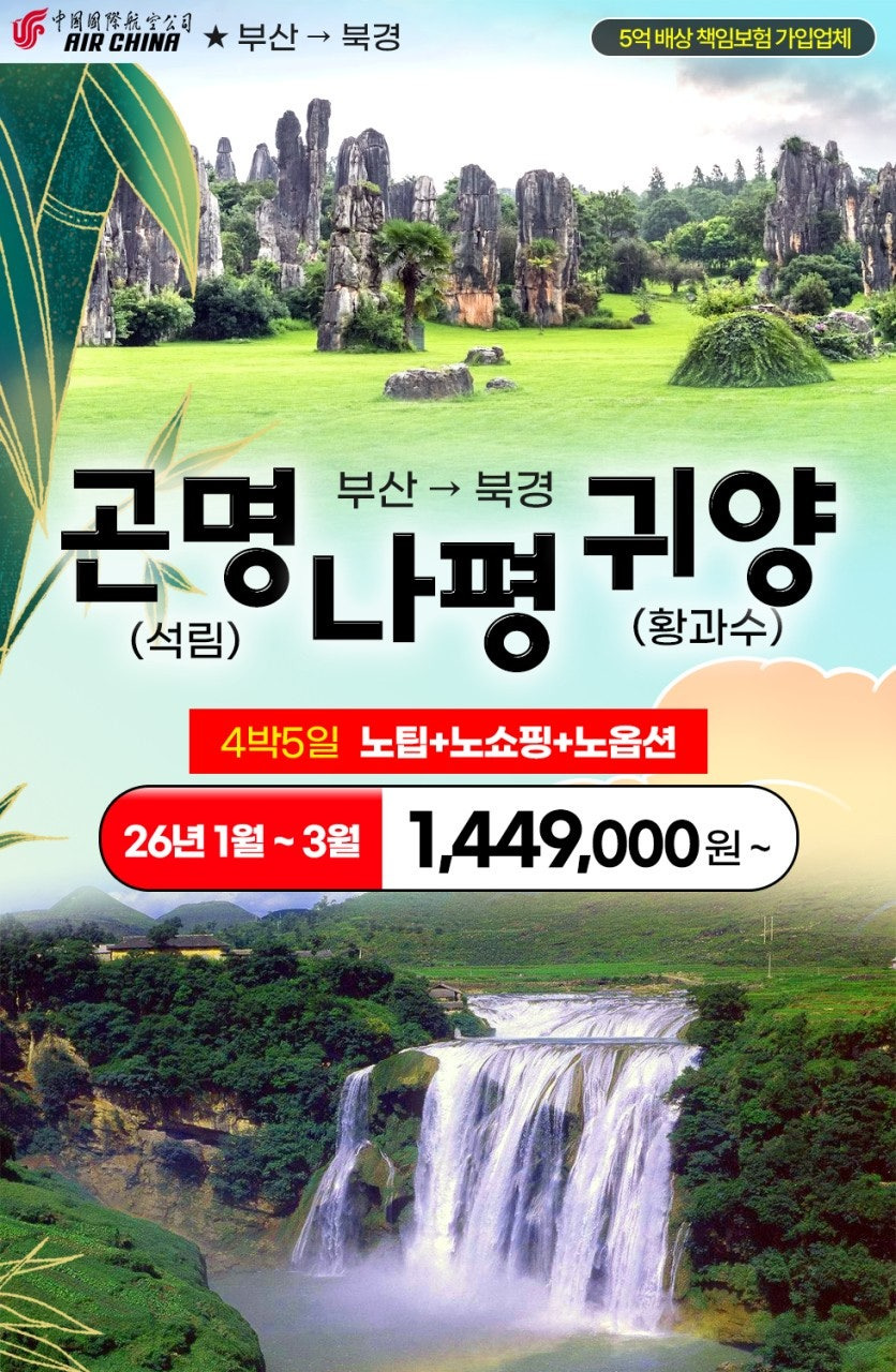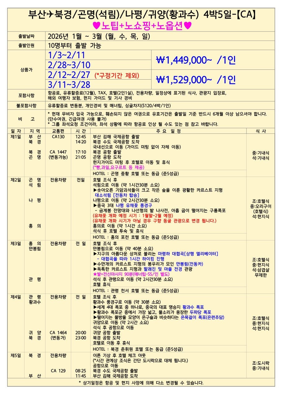 오늘은 다가오는 봄, 중국 여행의 하이라이트라고 할 수 있는 [곤명/나평/귀양] 패키지를 소개합니다. 이 상품은 단순한 관광이 아닙니다. 끝없이 펼쳐진 유채꽃의 향연과 웅장한 폭포의 소리를 온몸으로 느끼는 힐링 여행입니다. 특히 [노팁/노옵션/노쇼핑] 조건으로 진행되어, 현지 추가 비용 스트레스 없이 오직 여행에만 집중하실 수 있습니다.