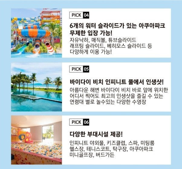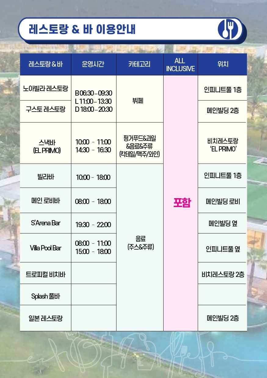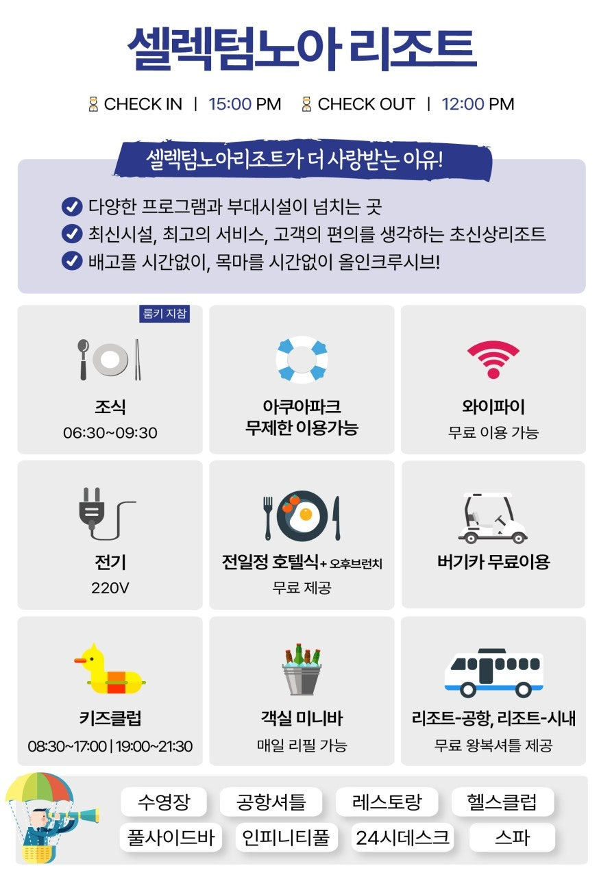 - 교통: 공항-리조트, 리조트-시내 무료 셔틀버스 운행