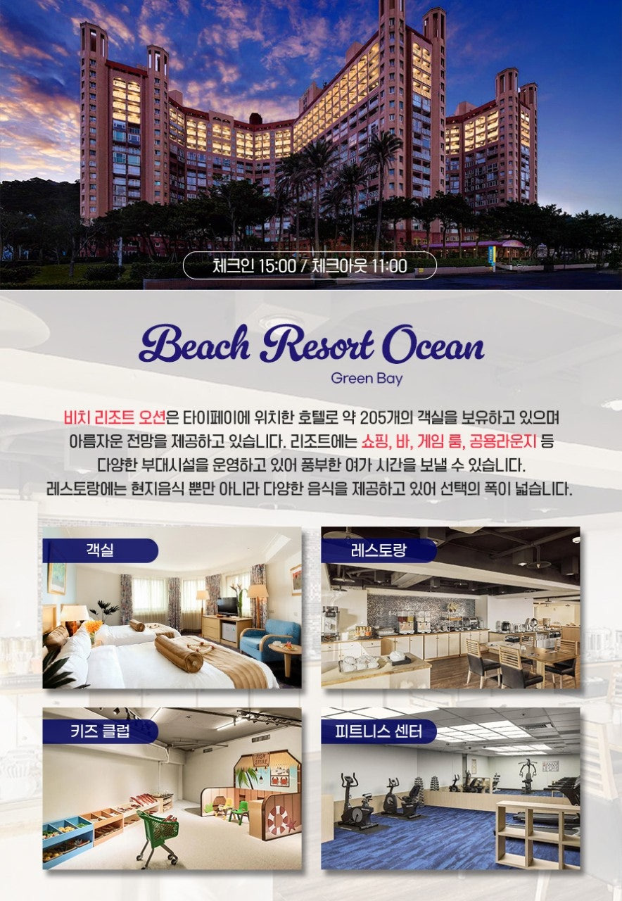 답답한 시내 호텔이 아닌, 대만의 아름다운 바다가 보이는 **[오션뷰 리조트]**에서 투숙하며 여유로운 휴식을 즐기실 수 있습니다.