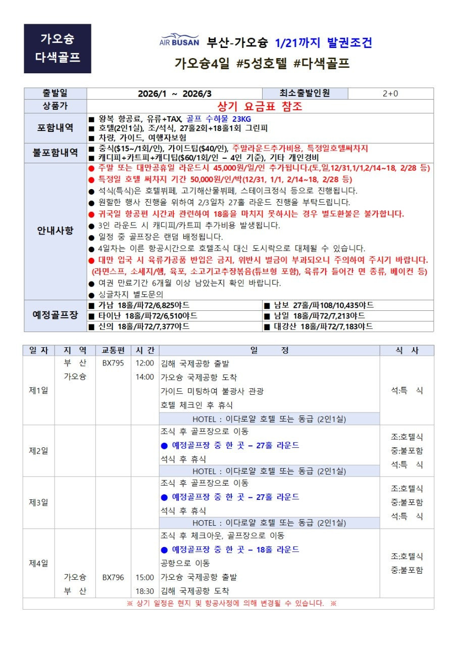 1월 21일까지만 발권 가능한 조건으로 나온 특가이니, 겨울 골프를 계획 중이라면 내용을 꼼꼼히 확인해 주세요.