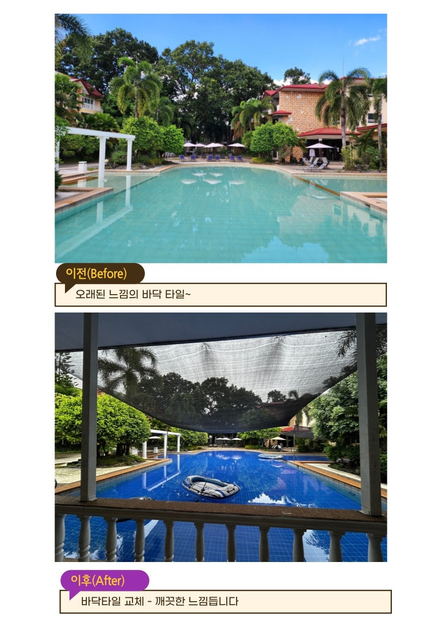 리모델링 포인트: 최근 객실 내 침대 매트리스, 벽지, 가구, 에어컨을 전면 교체했습니다. 복도 카펫과 로비, 수영장 타일도 새단장하여 매우 깔끔합니다.