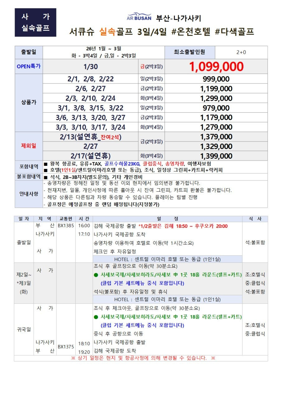1월~3월 나가사키 직항 전세기 골프 상품 📅주 3회 운항 / 화-3박4일, 금,일-2박3일 ✈️ 예정시간