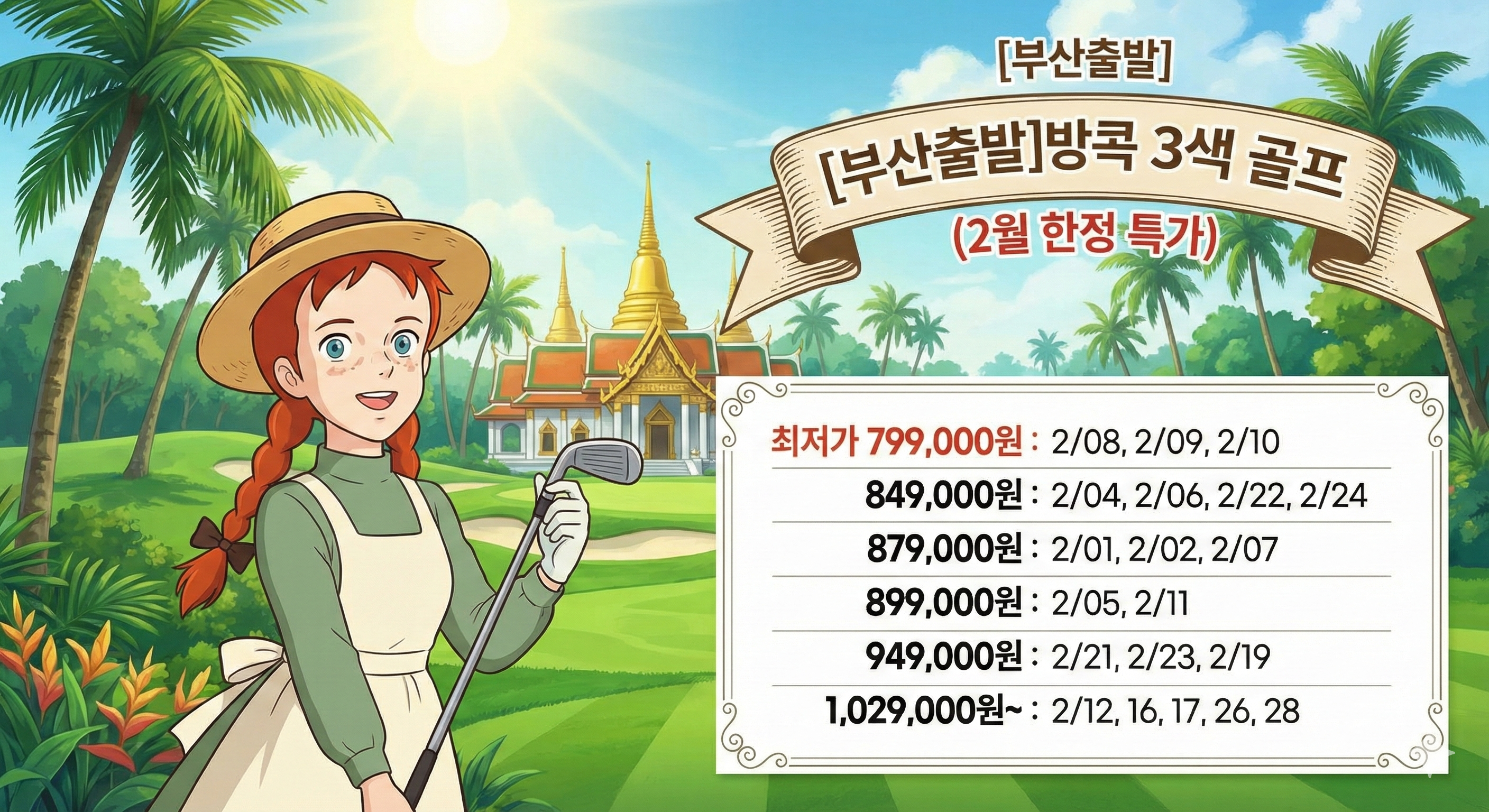 방콕 시내의 편리함과 골프의 즐거움을 동시에 누릴 수 있는 상품입니다. 특히 2월 8, 9, 10일 출발은 79만원이라는 파격적인 가격으로 출시되었으니 빠른 예약이 필수입니다.