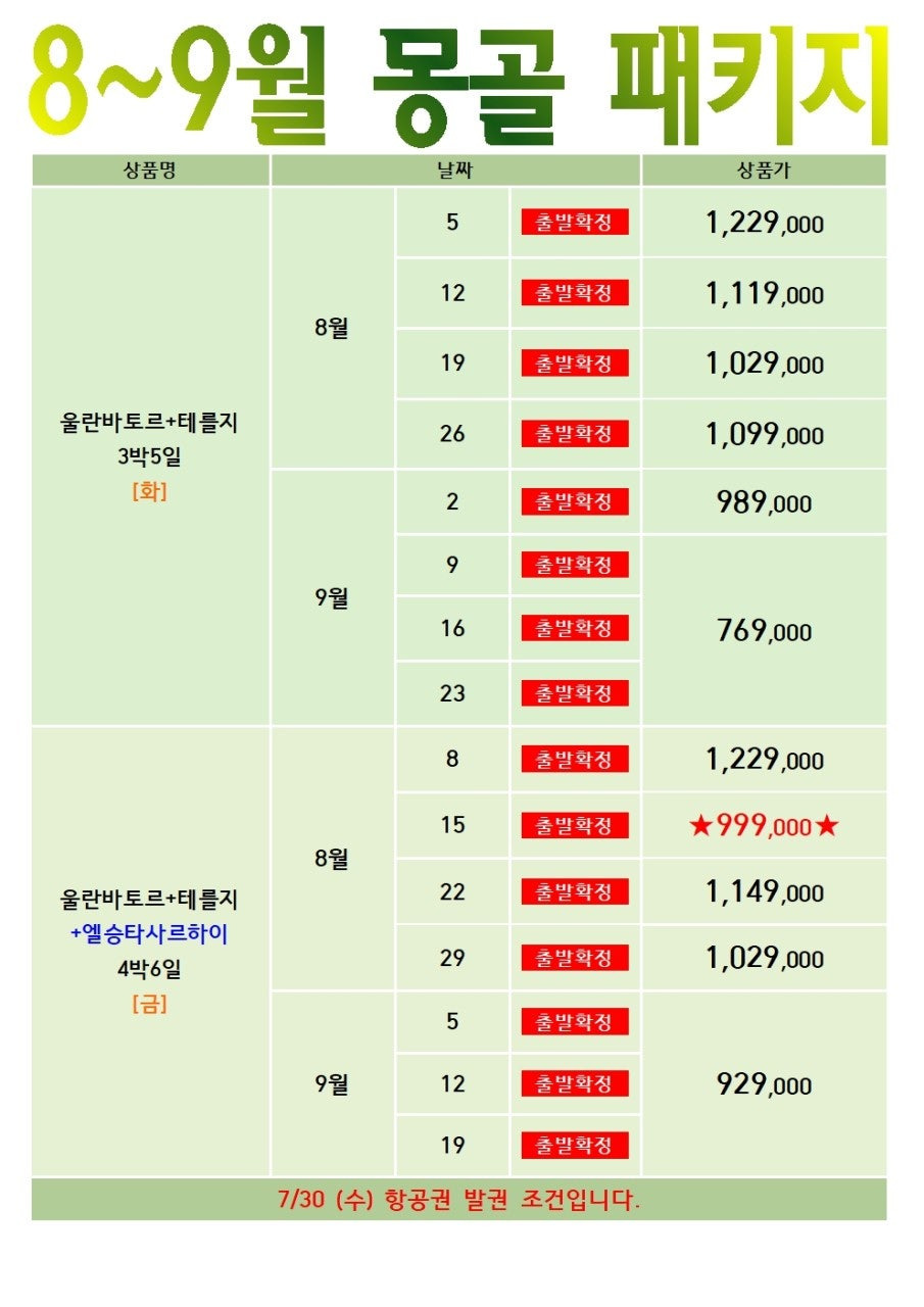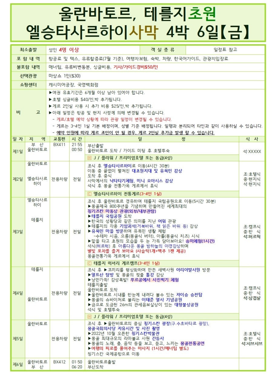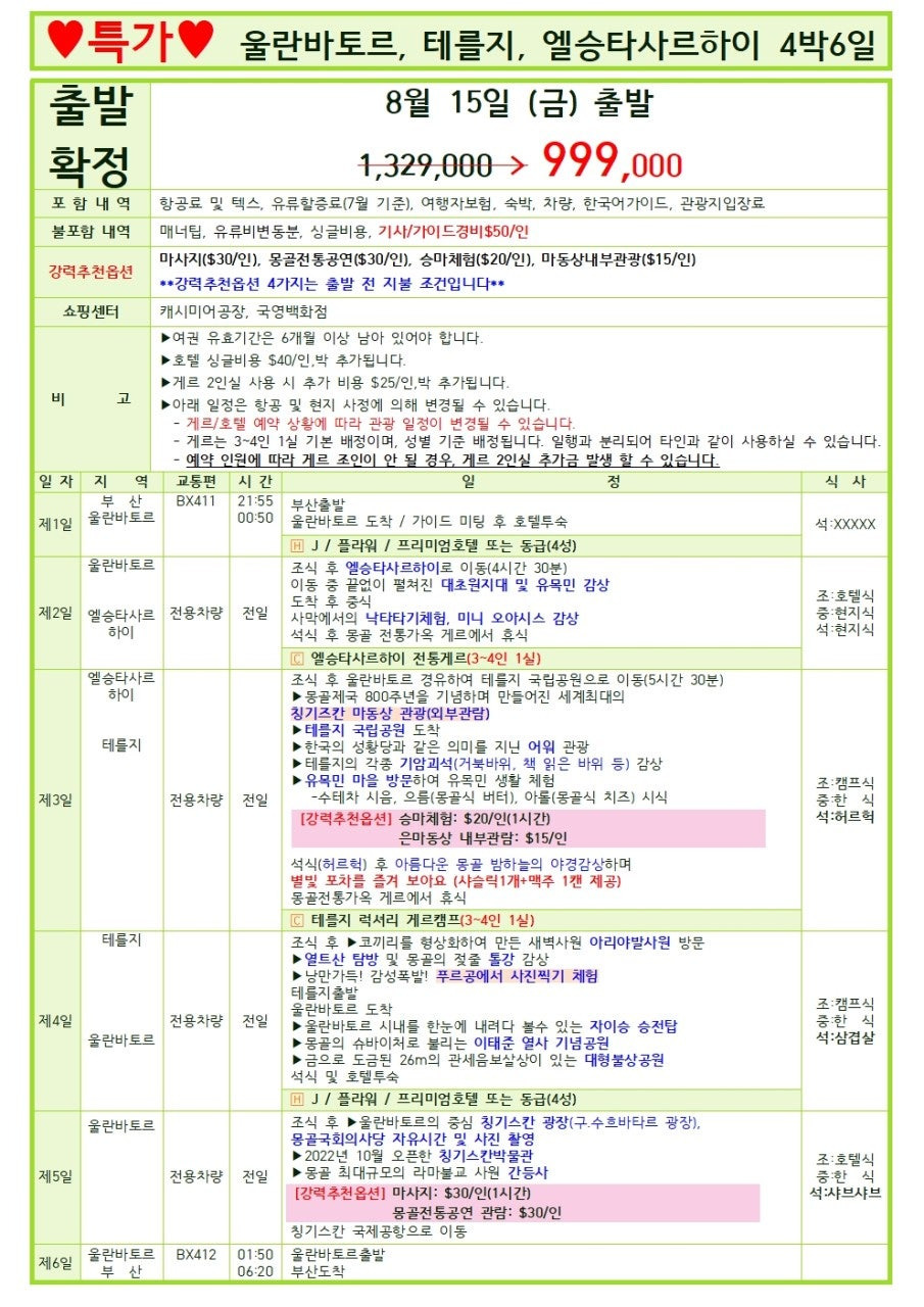 **📌몽골 패키지 특가 – 8월15일 출발, 4박6일 단독 오픈 특가!**