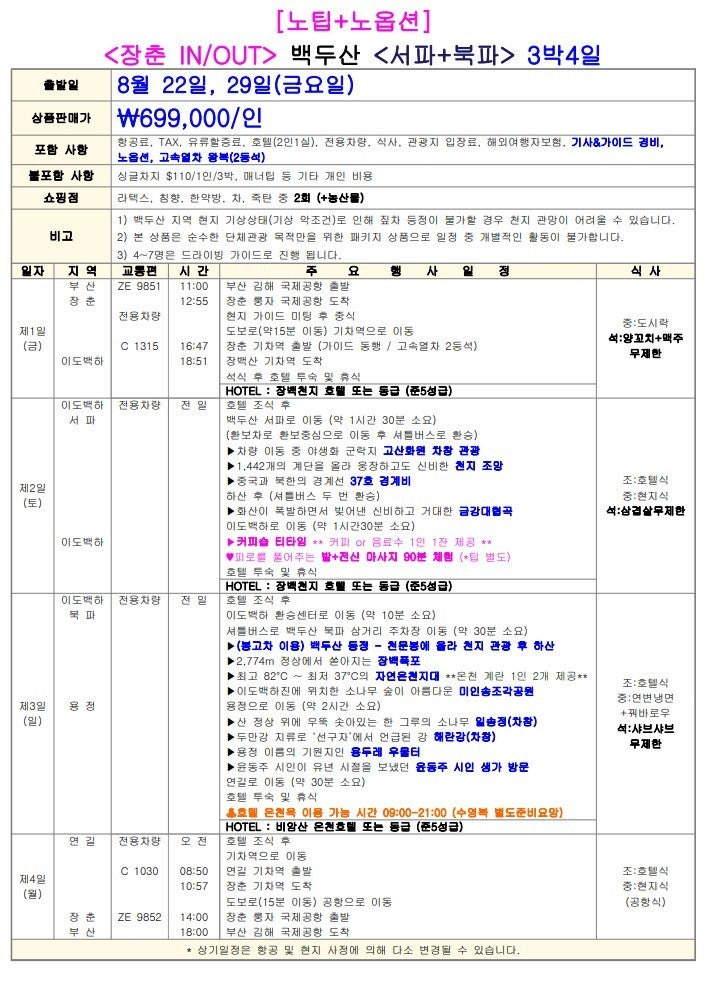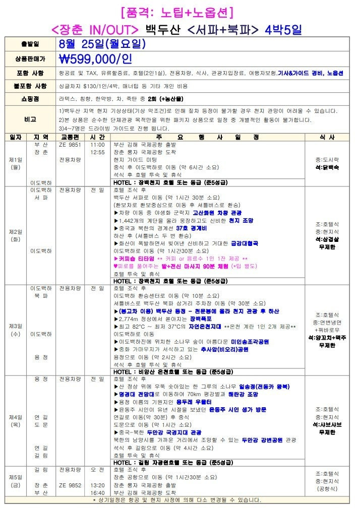 - 코스 : 연길 백두산(북+서파), 용정, 도문