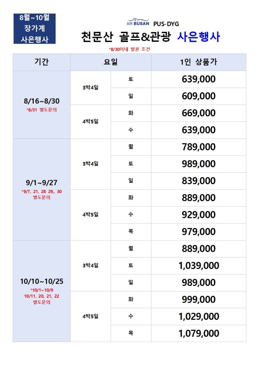 | 부산-계림 직항 산수CC 골프+관광 패키지 총정리 (10/29~12/17) (1) | 2025.08.16 |
