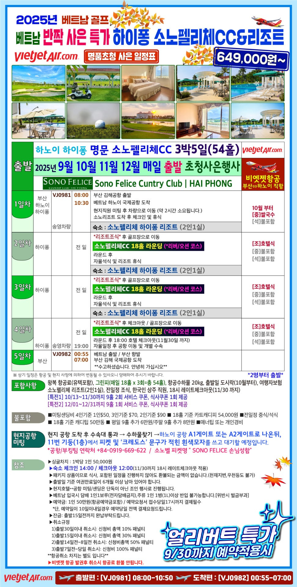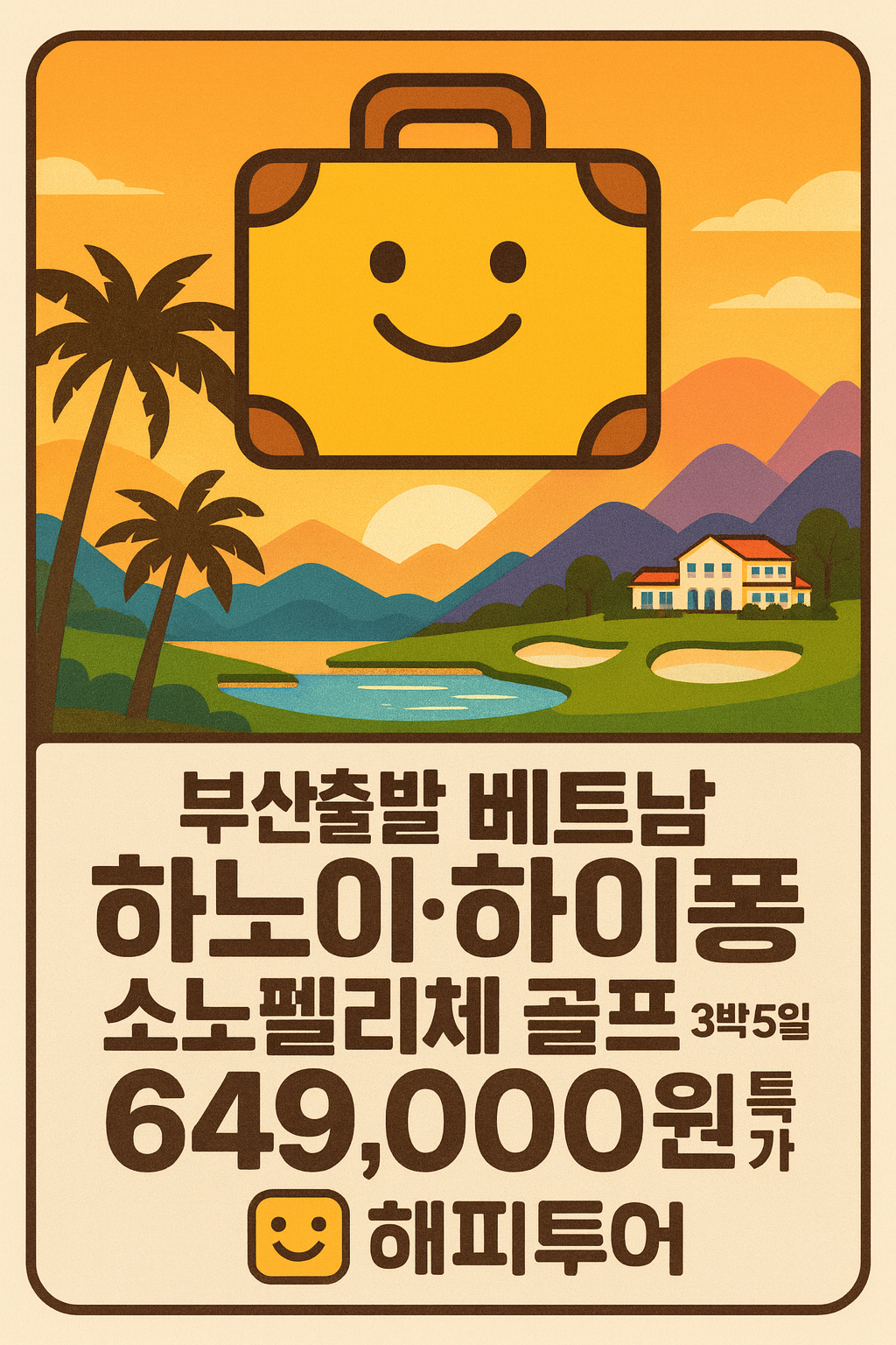 | 부산출발해외골프🌱베트남 하이퐁 소노펠리체 골프&리조트 – 3박5일 649,000원 특가 (0) | 2025.08.22 |